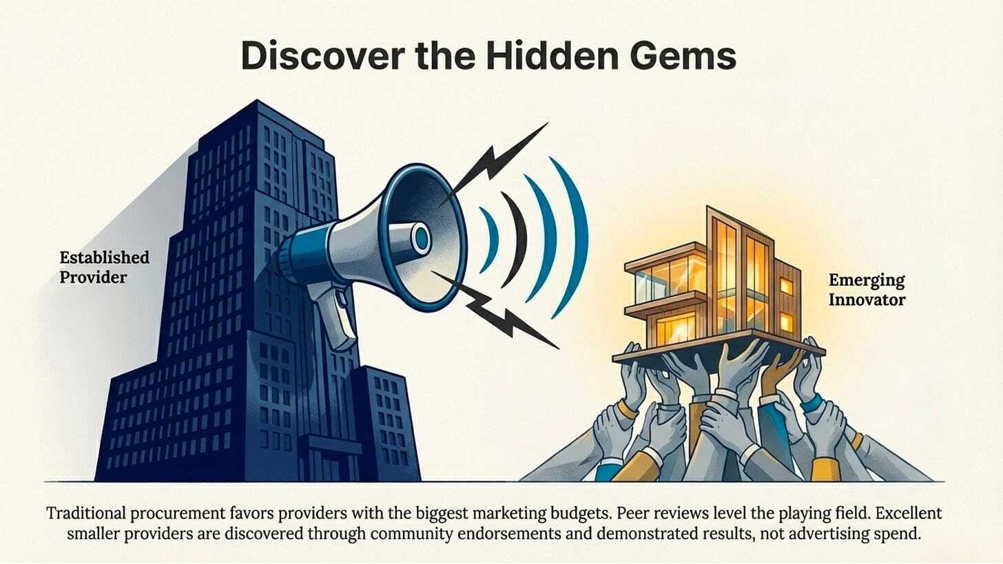 Traditional procurement favors established providers with marketing budgets and name recognition. Excellent smaller providers struggle to break through despite delivering superior value.