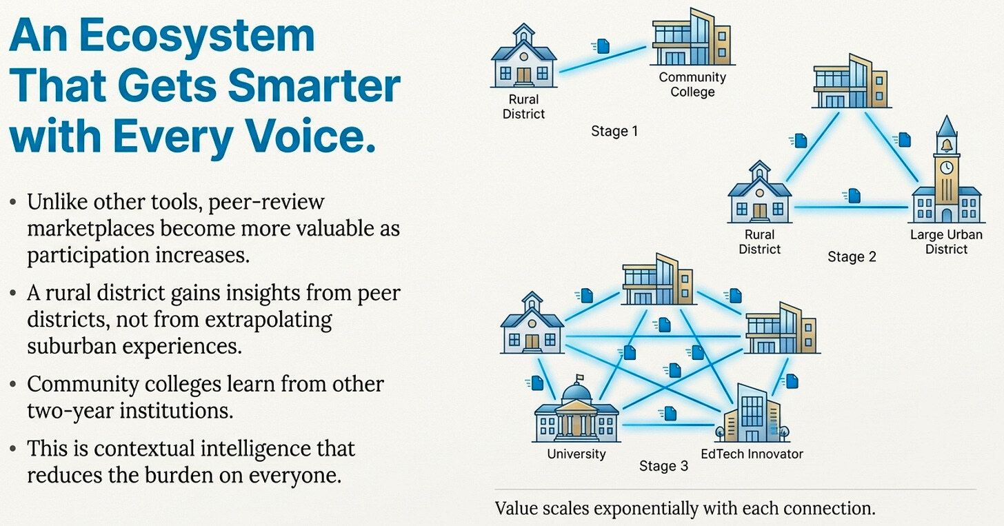 Peer-review marketplaces represent a fundamental shift—leveraging community knowledge to inform decisions that isolated institutions struggle to make effectively.