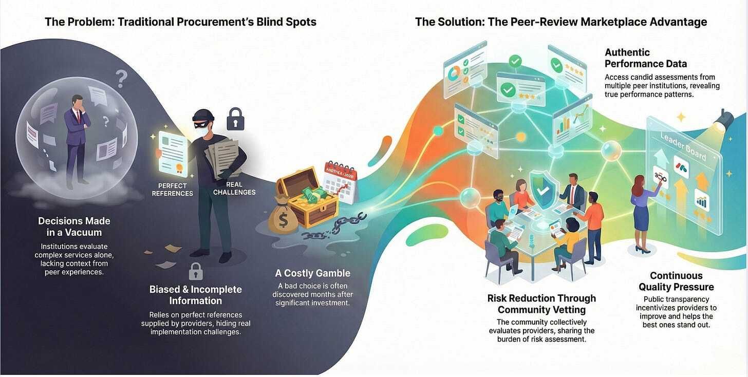 Every provider selection involves risk. Peer-review marketplaces don’t eliminate risk but redistribute it. Instead of each institution independently assessing provider capabilities, the community collectively evaluates them through actual partnership experiences.